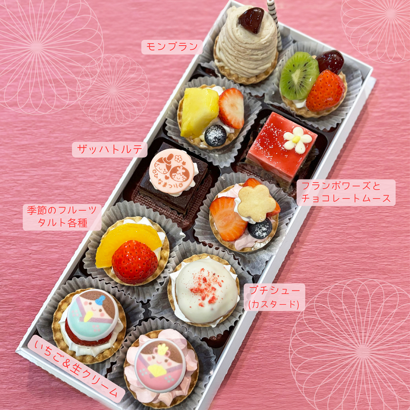 かわいい「ひなまつり」プチフールは、全10種類。Shika のお菓子を囲んで、お子さまの健やかな成長をみなさんでお祝いしませんか。